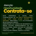 Publicado por SindservComentários desativados em ESTÁ DISPONÍVEL O EDITAL PARA CONTRATAÇÃO DE UM ÚNICO PROFISSIONAL COM CNPJ PARA ATUAR DENTRO DO SINDSERV PRESTANDO TODAS AS ATIVIDADES RELACIONADAS ABAIXO: MINISTRAÇÃO DE CURSOS EM INFORMÁTICA E MÍDIAS SOCIAIS, GERENCIAMENTO DO SITE INSTITUCIONAL, REDES SOCIAIS DO SINDSERV, CRIAÇÃO DE ARTES, DESIGNERS, PUBLICAÇÕES DIÁRIAS, VÍDEOS E OUTROS.